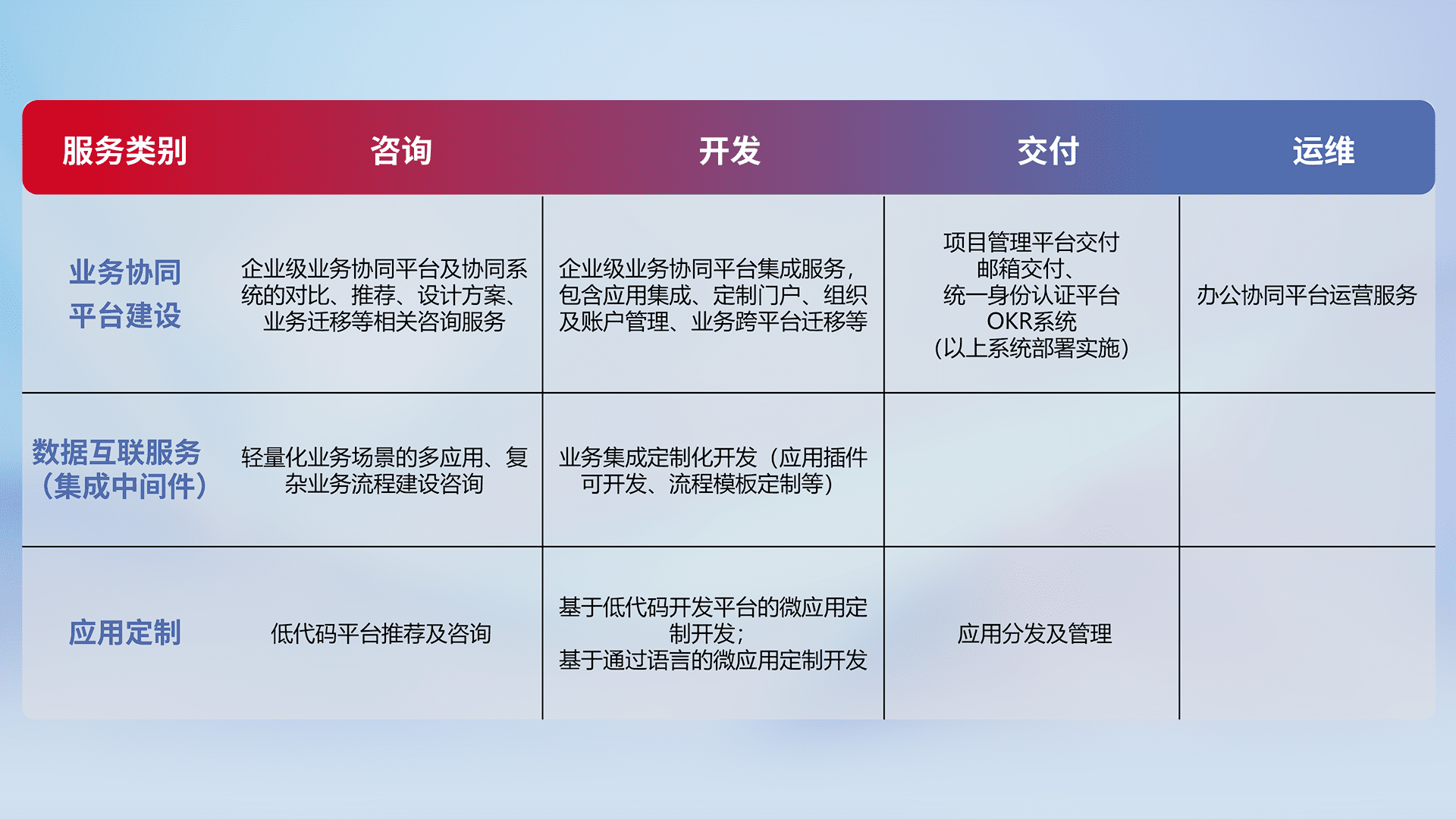 针对钉钉、、、企微、、、、IDaas等平台级产品提供产品的规划、、、方案、、、交付、、定制化开发等服务,,实现如统一协同办公、、、智能客户服务、、混合会议管理、、智能数据查询、、、、等业务场景,,实现数字化转型。。。。